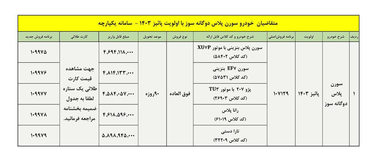گروه صنعتی ایران خودرو در جدیدترین شرایط فروش اعلامی ویژه متقاضیانی که در سامانه یکپارچه ثبت نام نمودهاند، خودروی سورن پلاس با موتور XU7P را عرضه میکند: